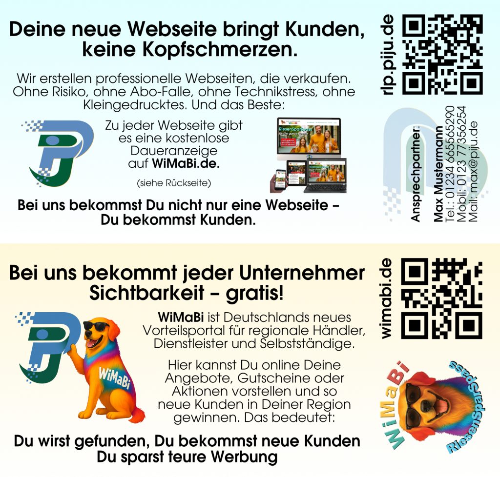 PIJU, die kreative Webagentur, die Unternehmern professionelle Webseiten erstellt, und WiMaBi, das Gutschein- und Werbeportal, das regionale Anbieter sichtbar macht.